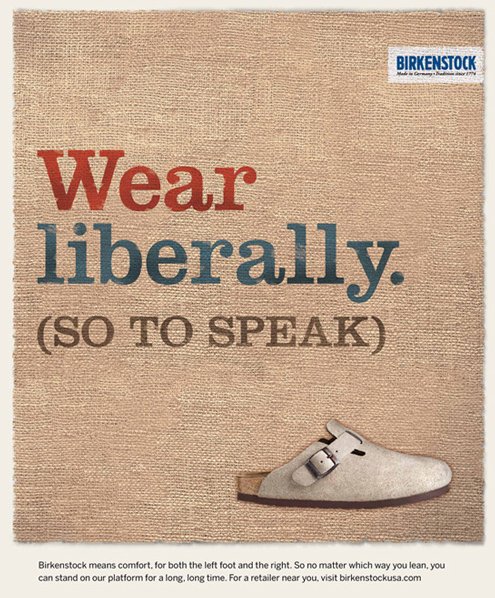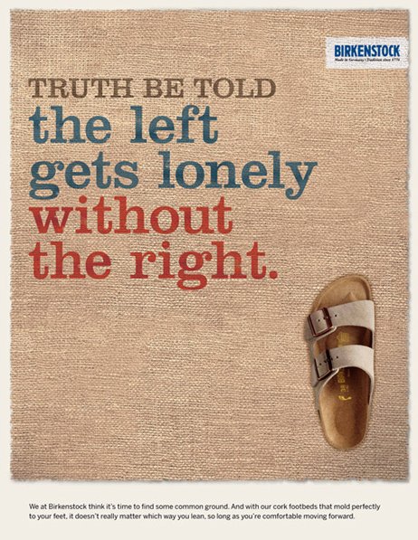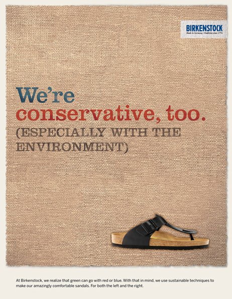 While Birkenstock has long been assigned political connotations (e.g., the reporter’s shorthand for committed progressives, “Birkenstock-wearing liberals”), at its core, this humble German sandal maker is about comfort and support. That’s a platform everyone can stand on. As presidential marketing slipped into negative mode in 2008, Birkenstock went positive inviting Americans to vote with their feet.