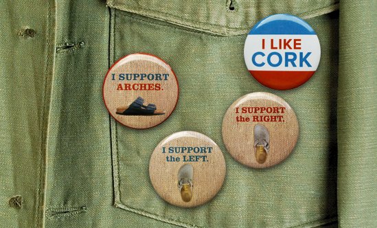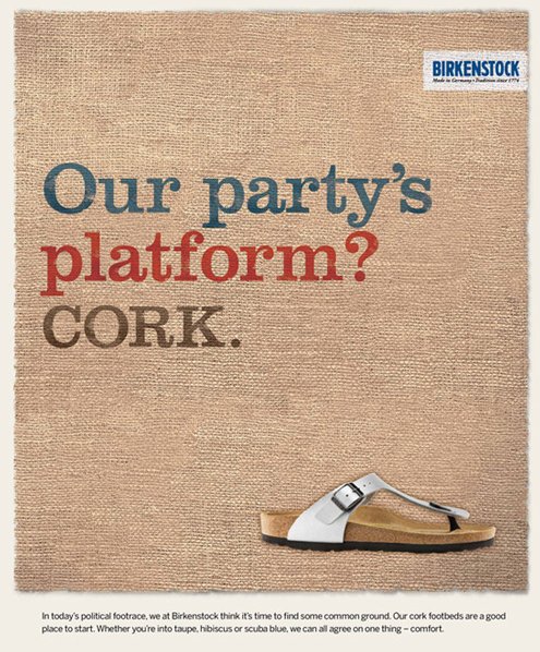 Copy: In today's political footrace, we at Birkenstock think it's time to find some common ground. Our cork footbeds are a good place to start. Whether you're into taupe, hibiscus or scuba blue, we can all agree on one thing – comfort.