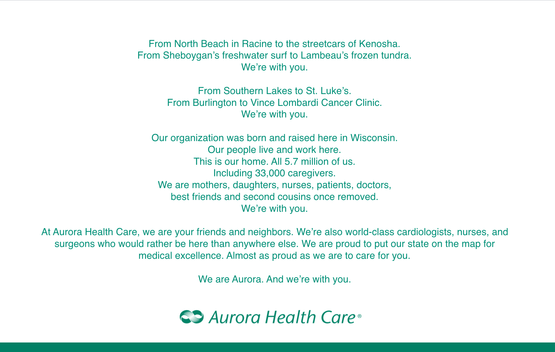 Wisconsin’s Aurora Health Care was facing competition from out-of-state providers. We developed the “We’re With You” campaign to remind people that to Aurora, Wisconsin isn’t just a market, it’s our home.